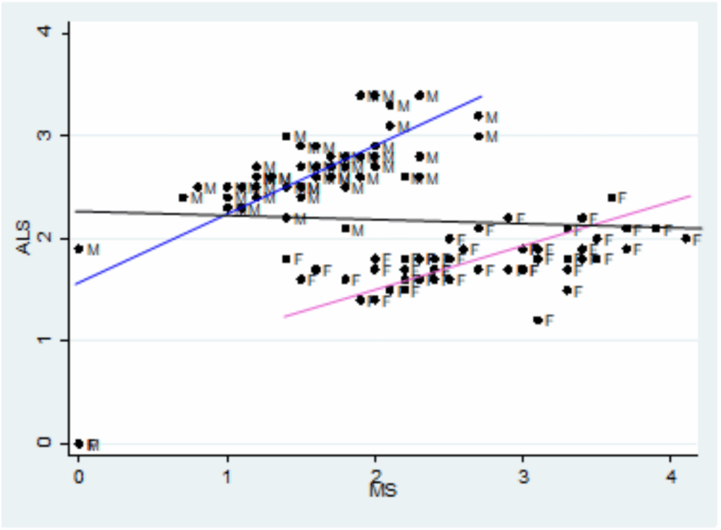 This could make sense, because death rates due to MS are higher for women, and death rates due to ALS are higher for men. So if we compare different groups with different proportions of males and females, it’s possible we could see something like Simpson’s paradox.